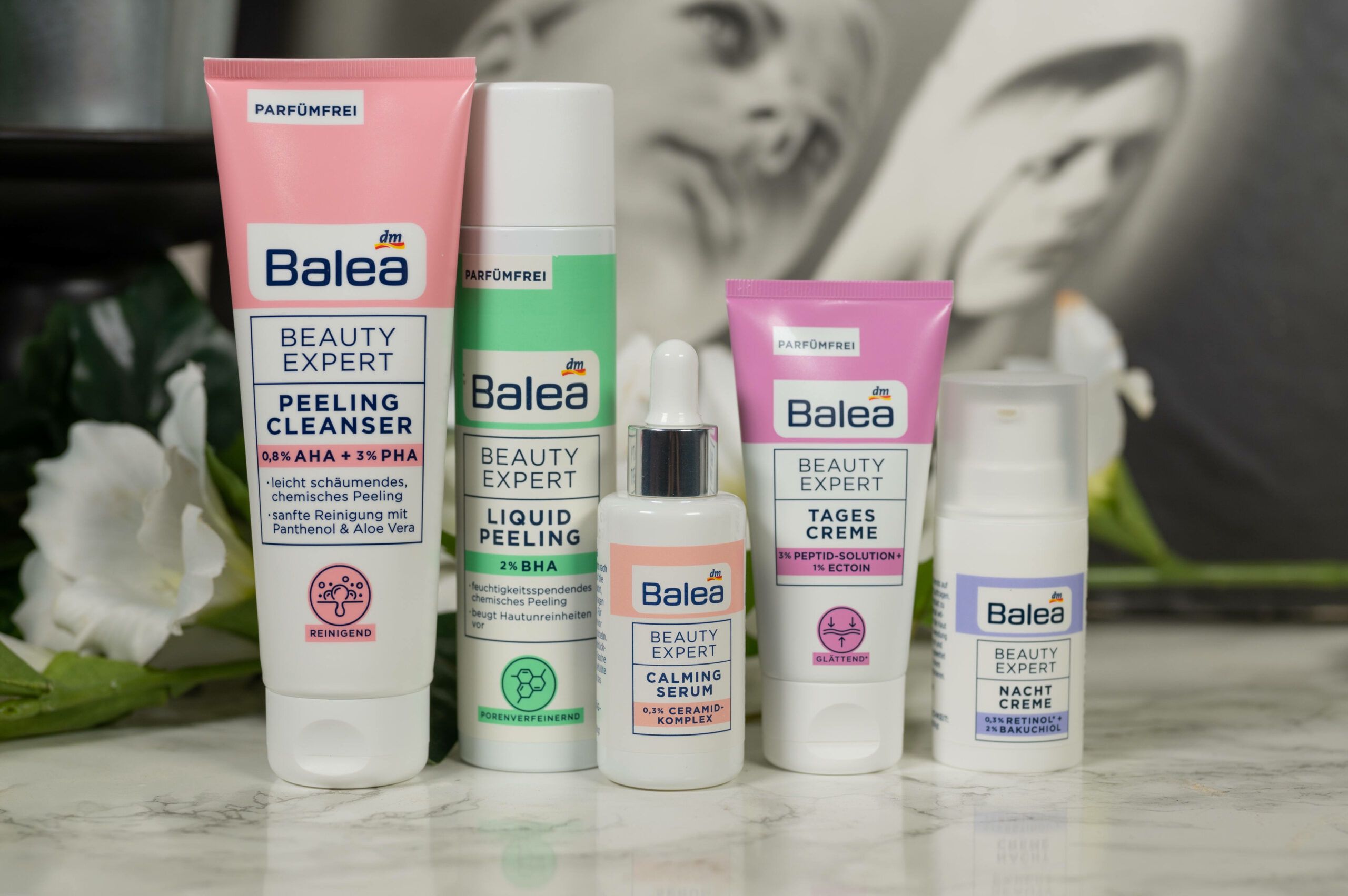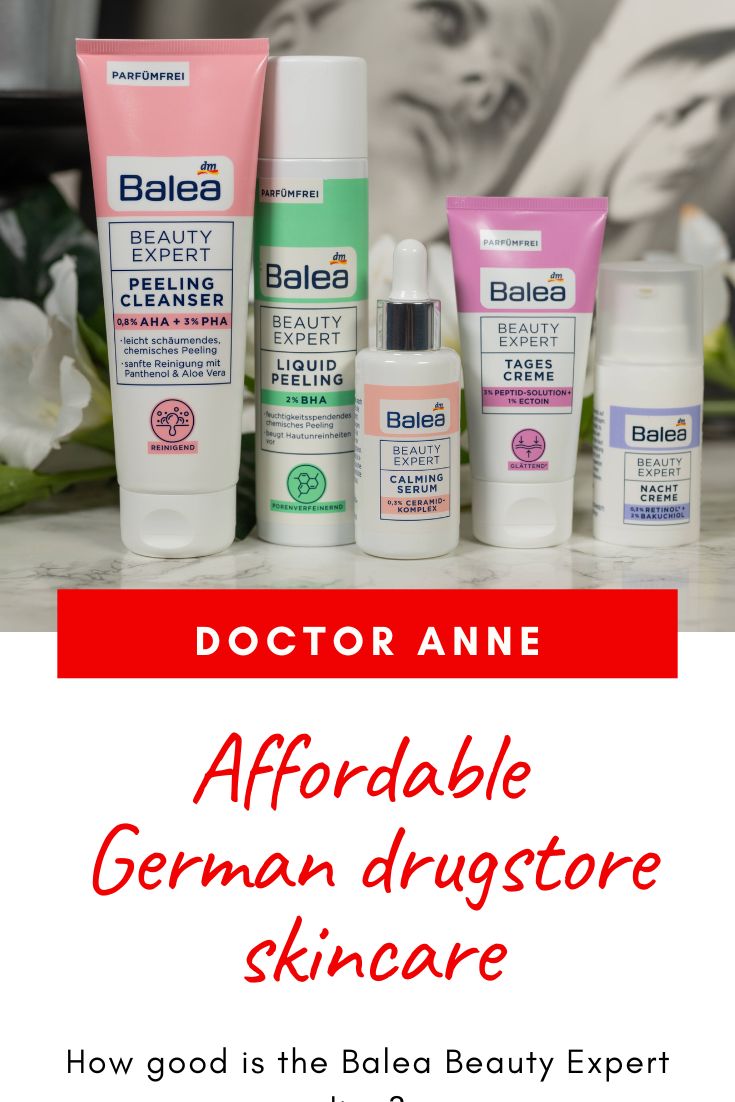 There is also only one serum step, the Balea Beauty Expert Calming Serum with 0,3% Ceramide Complex (30 ml for 5,95 €, fragrance-free, vegan, full review coming soon). I think it makes sense to add a calming serum into the line as the potential actives, the exfoliating acids and retinoids, are present in the cleanser, the toner and the night cream. After all inflammation and skin irritation are important factors when it comes to premature aging, and Ceramides are part of the skin’s outermost layer, creating the skin barrier you surely already have heard of that prevents transepidermal water loss and reduces irritation. (More info: The 5 steps you need to take to repair your skins barrier)