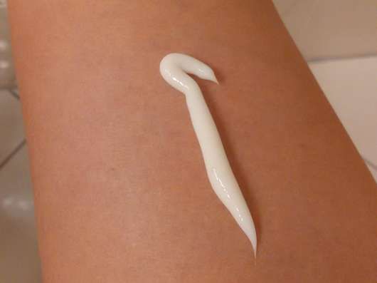 Die Öffnung hat die richtige Größe um das Produkt wunschgenau zu dosieren. Die Lotion selbst ist weiß und hat eine leichte, nicht fettende Konsistenz. Ich habe besonders im Sommer nur wenig davon gebraucht, da sie sich sehr gut verteilen lässt. Sie zieht innerhalb weniger Sekunden komplett in die Haut ein und es bleibt ein glattes, weiches, geschmeidiges Hautgefühl zurück. Für den Winter ist mir die Lotion bei meiner trockenen Haut nicht reichhaltig genug. Im Sommer versorgt sie meine Haut aber auf jeden Fall bis zur nächsten Dusche ausreichend mit Feuchtigkeit.