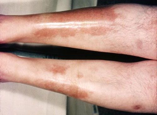 La dermopathie diabétique survient sur les deux tibias de manière asymétrique, mais elle a également été rapportée sur les cuisses, les bras et l’abdomen dans de rares cas.