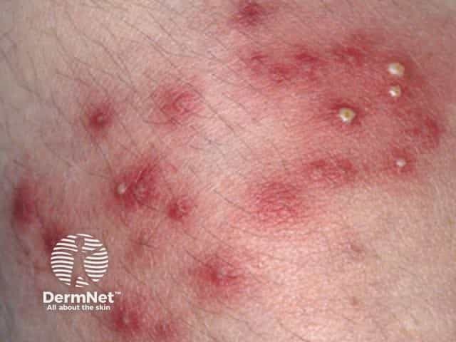 A close-up of multiple perifollicular papules with extrafollicular and transfollicular penetration.