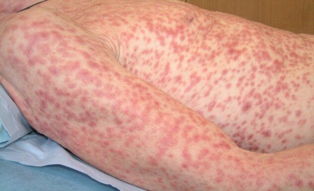 rode plekjes (iets verheven) aan armen en benen, billen en gelaat. Soms ook blaasjes.