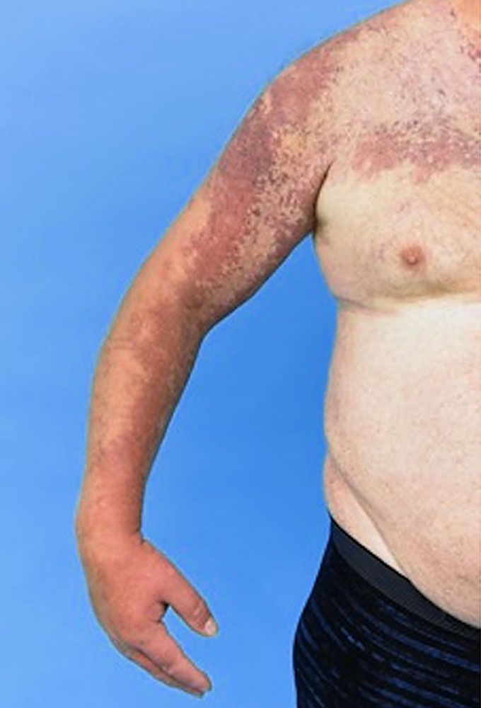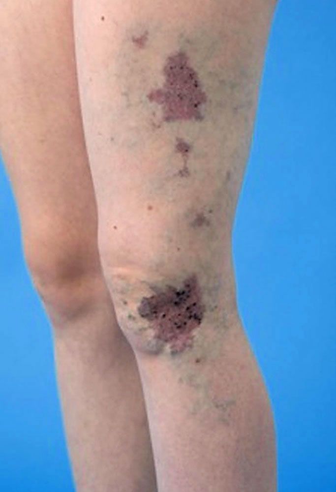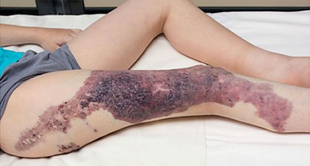 Cutaneous haemangioma seen on left thigh of a patient with Klippel-Trénaunay syndrome (limit of edges outlined by blue arrows).