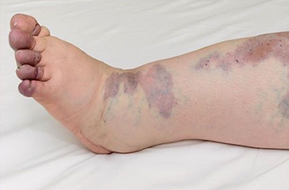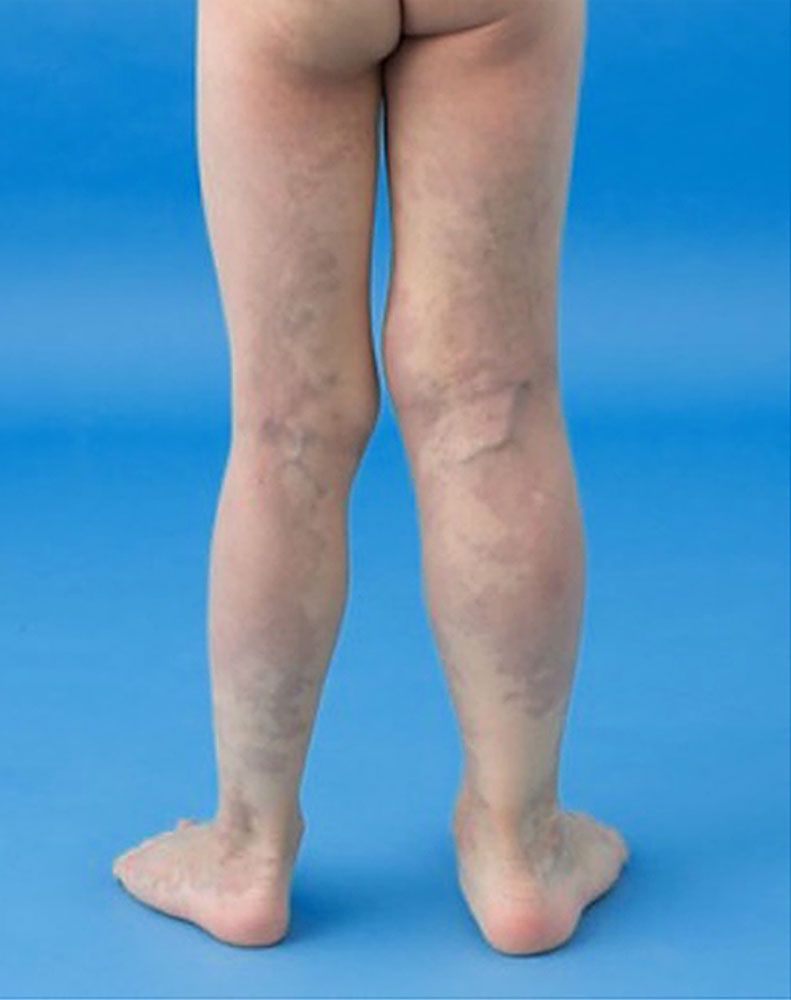 KTS without lymphatic involvement is diagnosed as diffuse capillary malformation with overgrowth (DCMO), which presents with more proportionate overgrowth and diffuse or reticulate stains [5]. The mosaic mutation can occur at any stage of in utero developmental process, and the severity of KTS depends on the timing of this mutation during this developmental stage. If this mutation occurs early in the developmental stage, it will cause severe disease expression after birth. At birth, patients usually present with a vascular stain (port-wine stain), which is geographic or blotchy/segmental, dark-red, purple, or pink-red [6]. The skin discoloration is also proportionate to disease severity. Venous varicosities in the anterolateral thigh and leg are usually present at birth or in infancy due to the abnormal embryonic avalvular venous structure [7]. In childhood, the lymphatic malformation presents with chronic leakage of lymph or blood or secondary infection with pseudoverrucous hyperplasia and lymphedema, which leads to enlargement of the affected limb. The disfigurement of the genitalia can happen due to deep lymphatic malformation in the pelvis and retroperitoneal region [8]. The reasons for limb overgrowth could be multifactorial, such as soft tissue and bone overgrowth with or without vascular and lymphatic malformation [8]. There is a cohort study of 48 people in which 23 (48%) patients presented with superficial venous thrombosis, 16% (8 among 48 people) developed deep vein thrombosis and pulmonary embolism, and 2% people developed pulmonary embolism [9].