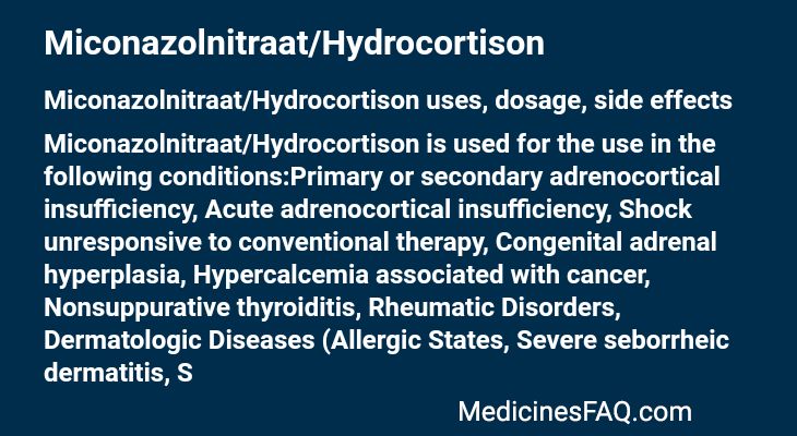 Tablet: The initial dosage of Miconazolnitraat/Hydrocortison Tablets may vary from 20 mg to 240 mg of hydrocortisone per day depending on the specific disease entity being treated. In situations of less severity, lower doses will generally suffice, while in selected patients higher initial doses may be required. The initial dosage should be maintained or adjusted until a satisfactory response is noted. If after a reasonable period of time there is a lack of satisfactory clinical response, Miconazolnitraat/Hydrocortison Tablets should be discontinued and the patient transferred to other appropriate therapy.