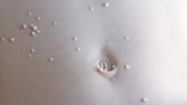 The incubation period ranges from two weeks to six months. Molluscum contagiosum virus infects only keratinocytes, and skin lesions are limited to the epidermis and do not have systemic dissemination. Molluscum contagiosum virus produces proteins inhibiting human antiviral immunity, thus preventing the development of innate immunity response, and contributing to the persistence of skin lesions.[7]