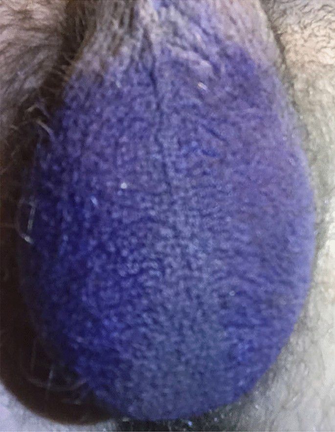 On examination, the erythema was well-demarcated, closely following the distribution of hair on the bilateral scrotum and also involving a small portion of the hair-covered ventral shaft of the penis. There was sparing of erythema along the hairless portion of the scrotal midline and the hairless underside of the scrotum (Fig. 1). There was no evidence of ulceration or swelling, and there was no tenderness on palpation of the affected area. The patient first sought care with his primary care physician, where HIV testing and HSV 1 and 2 serum antibody testing were performed and were all negative. The patient then completed a 4-week course of topical clotrimazole cream with no improvement in symptoms. A 10-day course of erythromycin was also tried under the assumption that the condition represented an atypical presentation of erythrasma, but also with no improvement.