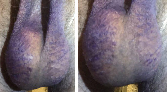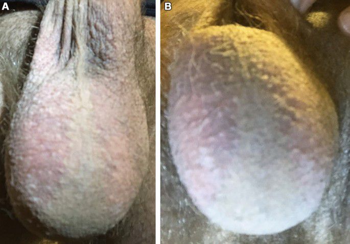 At condition onset, the patient was a 26-year-old man with a history of recurrent tinea versicolor affecting the trunk and neck and no other significant medical history, including no history of topical corticosteroid use. He experienced the abrupt onset of erythema of the bilateral scrotum accompanied by intense itching and burning. The signs and symptoms began one morning following sexual intercourse with a female partner the previous night. The patient did not clean up after intercourse and fell asleep lying on his back with vaginal secretions covering his scrotum.