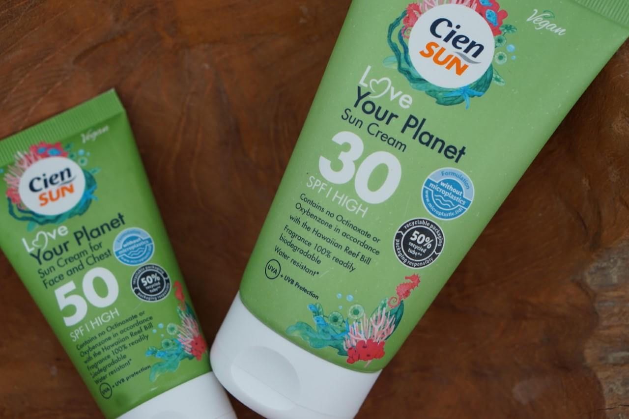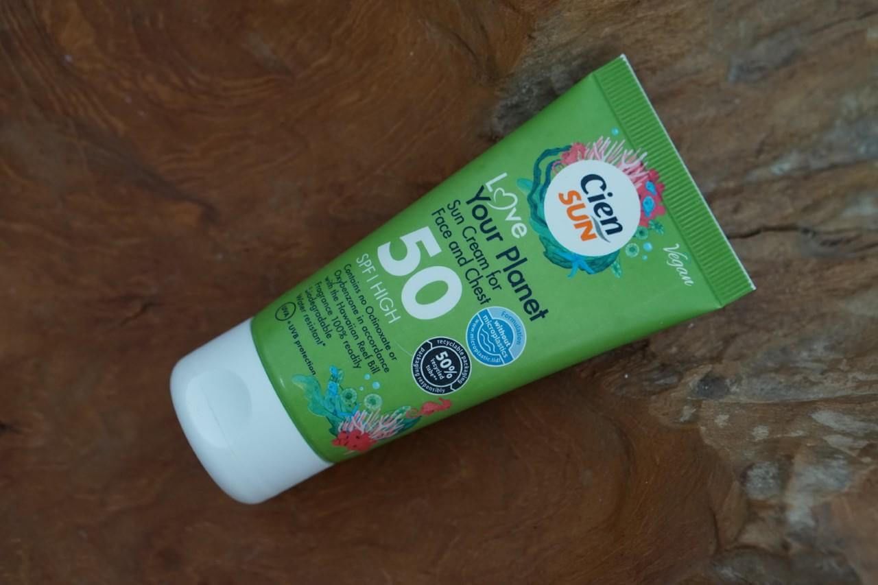 Speciaal voor je gezicht heeft Cien Sun de Love Your Planet suncream for face and chest. Deze is alleen maar in een SPF 50 variant verkrijgbaar en zit in een tube met 50 ml inhoud. Ook hier betaalde ik nog geen vijf euro voor en daarvoor kreeg ik een product waar ik erg enthousiast over ben. De creme smeert fijn uit, is absoluut niet vet en doet het zelfs goed onder mijn make-up.