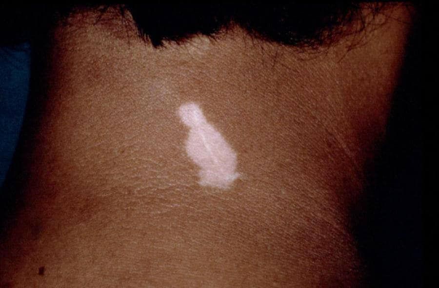Bij vitiligo ontstaan witte plekken zonder pigment op de huid. Meestal zijn de plekken te vinden rond lichaamsopeningen, zoals de mond, ogen en geslachtsdelen. Ook komt vitiligo vaak voor op de handen. Wanneer vitiligo ontstaat op een stuk huid met haren erop, is het ook mogelijk dat de haren verder groeien zonder pigment en dus wit worden. De plekken die zijn aangedaan kunnen vervelend jeuken.